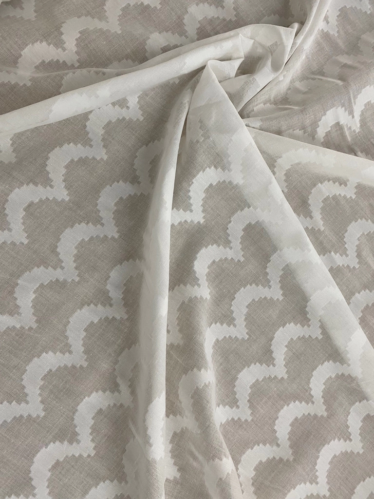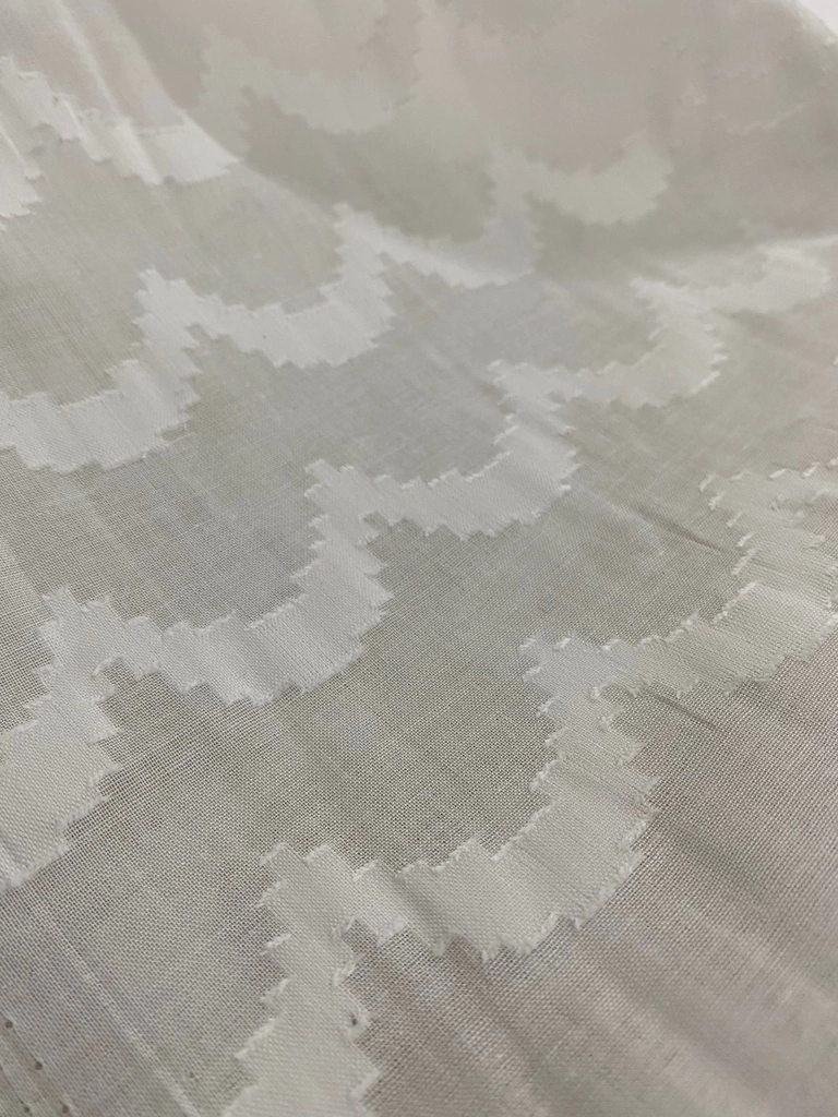 Corte cambraia de algodão, tem um tipo de brocado como se fosse “bordado por cima”, macia e leve, bom caimento e boa transparência, pode ser usado tanto para roupas em geral quanto artigos de decoração. Ton puxado para Off White