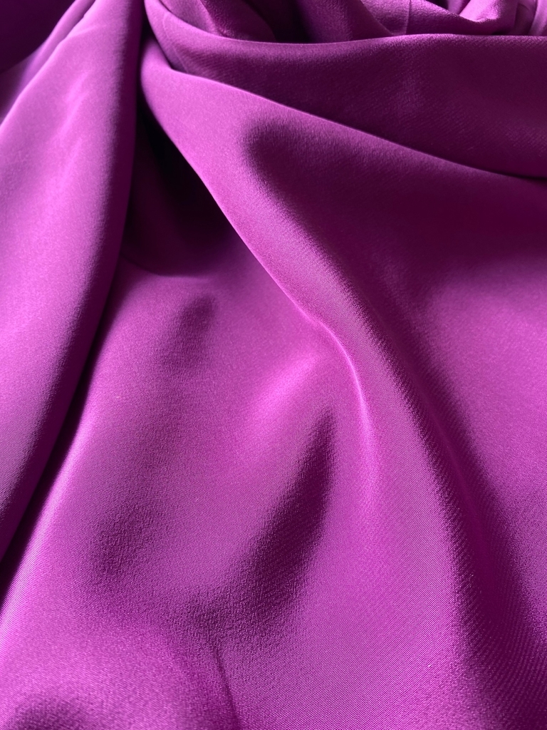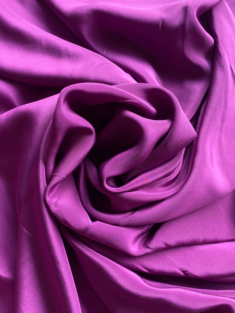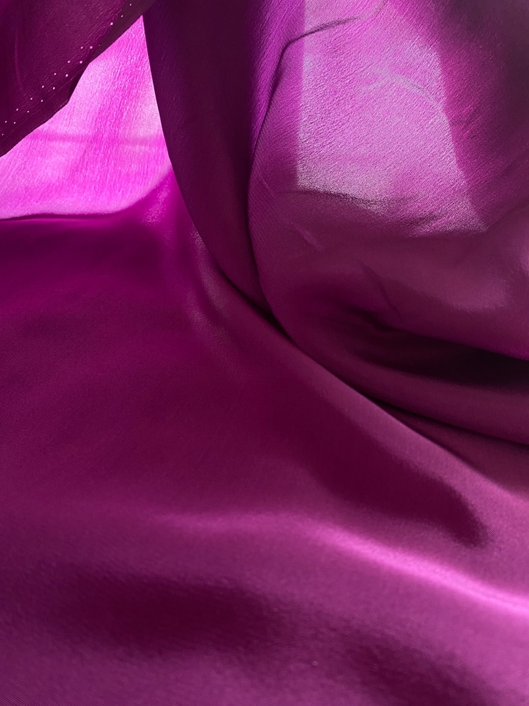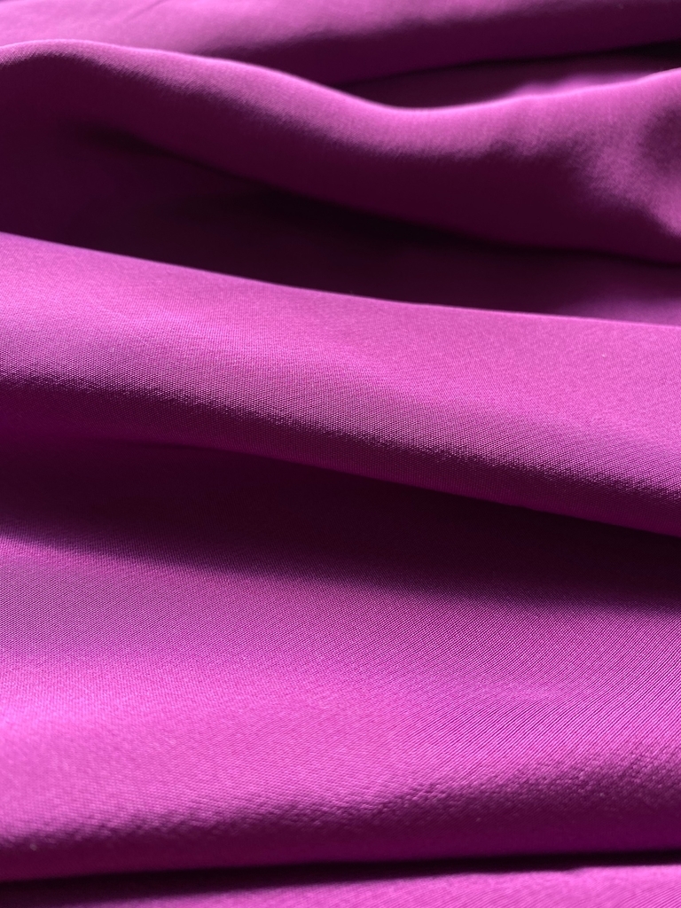 Tecido plano de seda tinto, cor puxada para um roxo claro meio acetinado, macio e leve, com bom caimento e baixa transparência considerando o tipo de tecido. Pode ser usado para blusas, vestidos, saias, camisas etc.