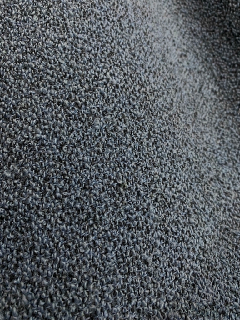 Corte plano de lã pura, tipo tweed, ton de azul mesclado com preto, macio e de boa gramatura, médio caimento e baixa transparência considerando o tipo de tecido. Pode ser usado para roupas, principalmente de inverno como casacos, blazers e acredito que até calças, além de artigos para decoração como colchas, mantas etc.