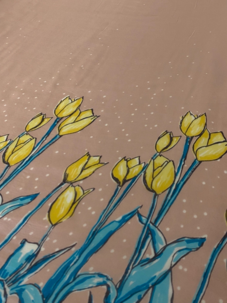Tecido plano georgete de seda pura estampada, macia e leve com bom caimento, barrado dos dois lados.