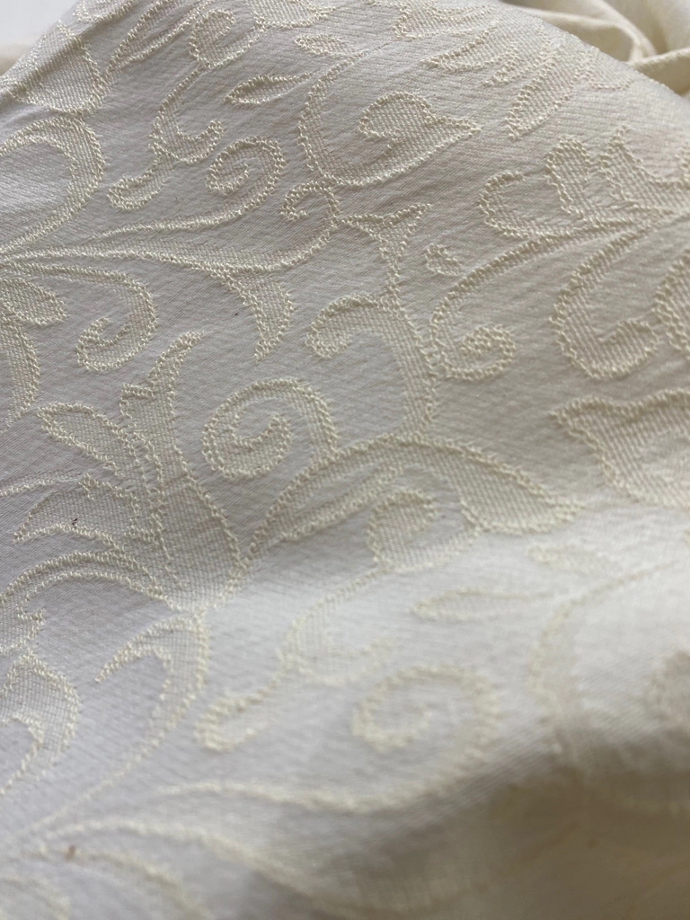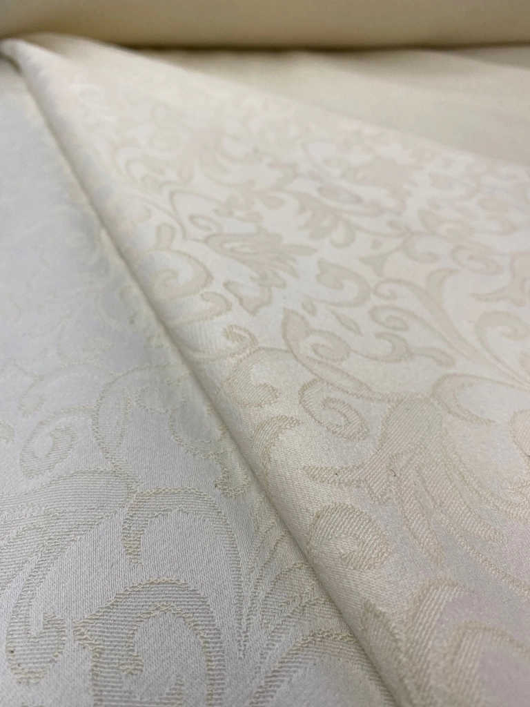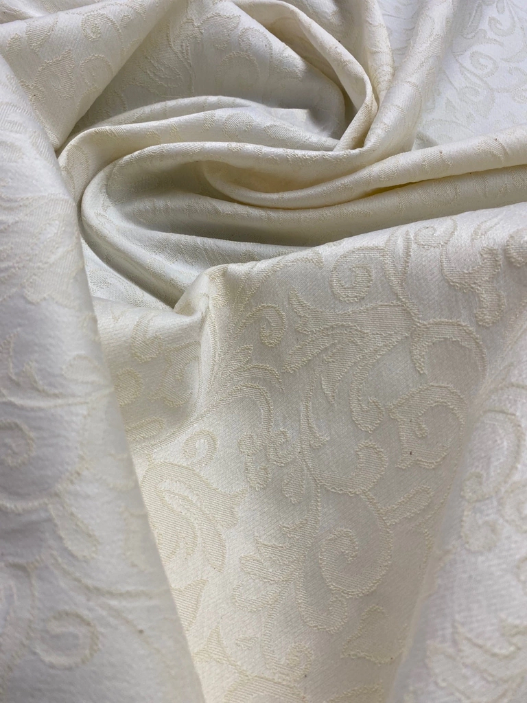 Tecido plano de algodão com poliester e elastano, ton puxado para o marfin, macio e de boa gramatura, bom caimento e baixa transparência. Pode ser usado para alguns tipos de roupas e até artigos de decoração.