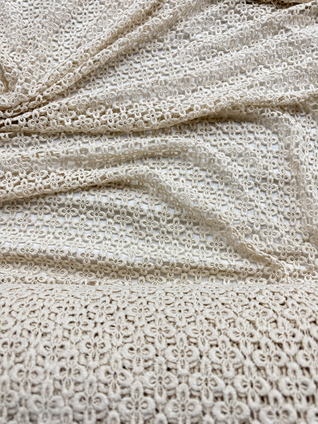 Tecido de renda de algodão sem acabamento, em cru, toque macio e leve, bom caimento e média transparência. Pode ser usado para roupas em geral e até artigos de decoração.