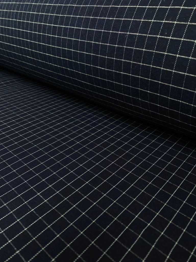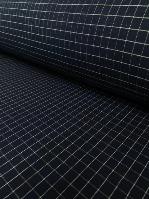 Tecido plano sarjado xadrez fio tinto, macio porem com um toque mais seco, encorpado sarjado bem fechado, pouquíssimo caimento e sem transparência. Pode ser usado para alguns tipos de vestuários mas principalmamte para artigos de decoração como toalhas de mesa, jogos americanos, capa de almofada etc. 1,50 Largura 100% Algodão Cor puxada para um azul marinho escuro