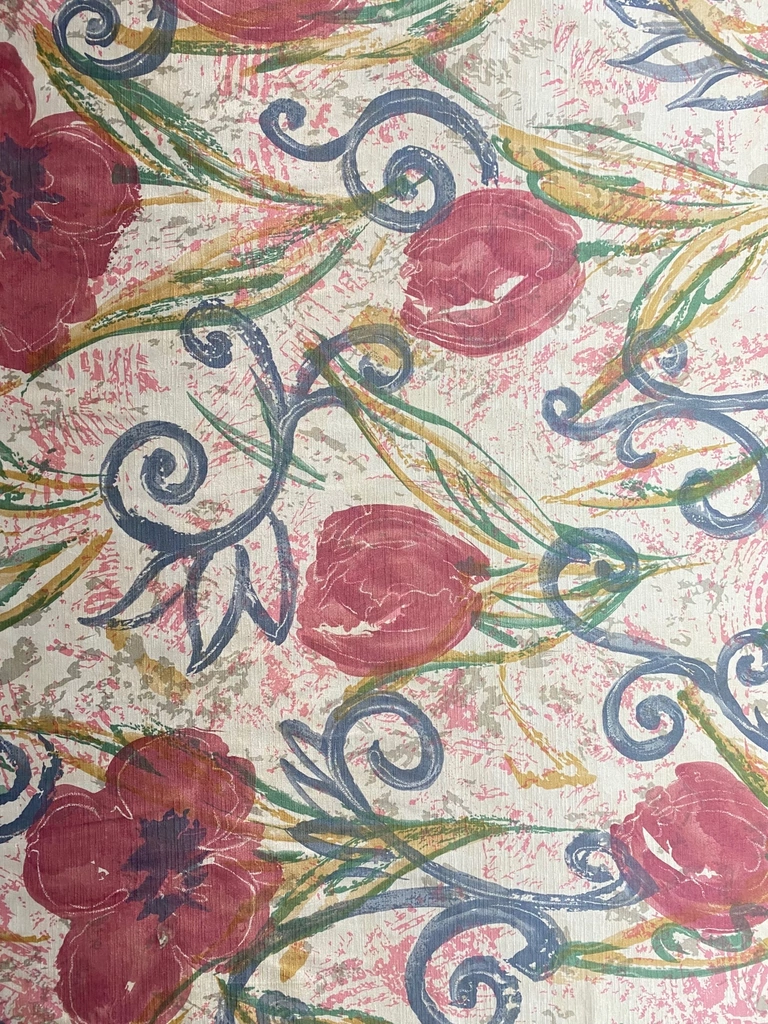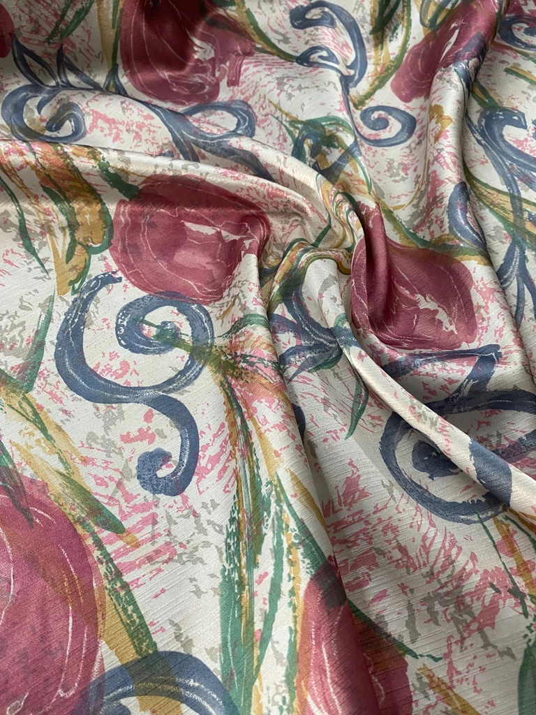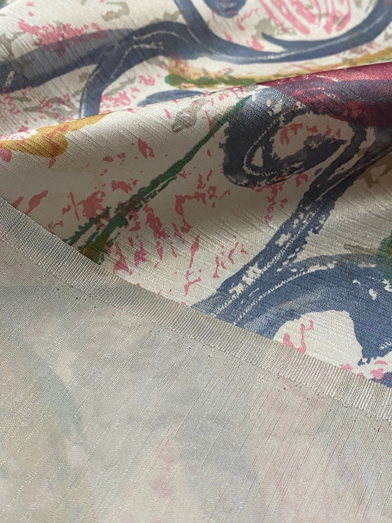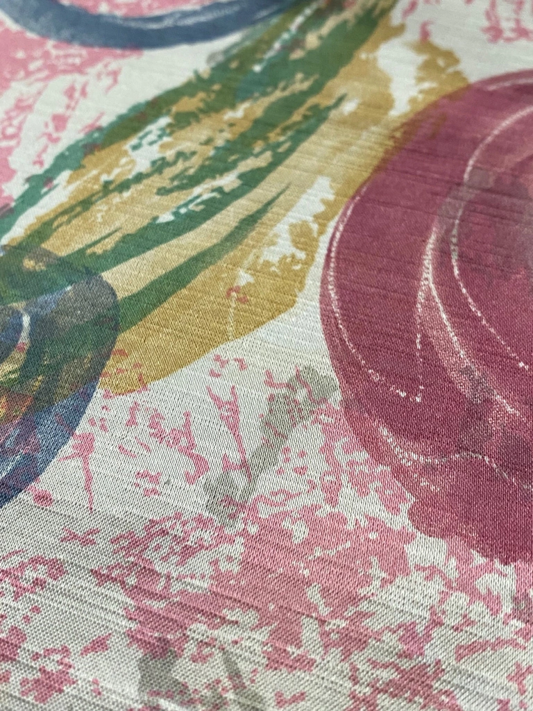 Tecido plano de poliester shantung estampado, macio e encorpado, médio caimento e baixa transparência, tem uma superfície até que lisa, mesmo com a textura do shantung. Pode ser usado para alguns tipos de roupa, mas também é usado em capas de almofadas, toalhas, cortinas etc.