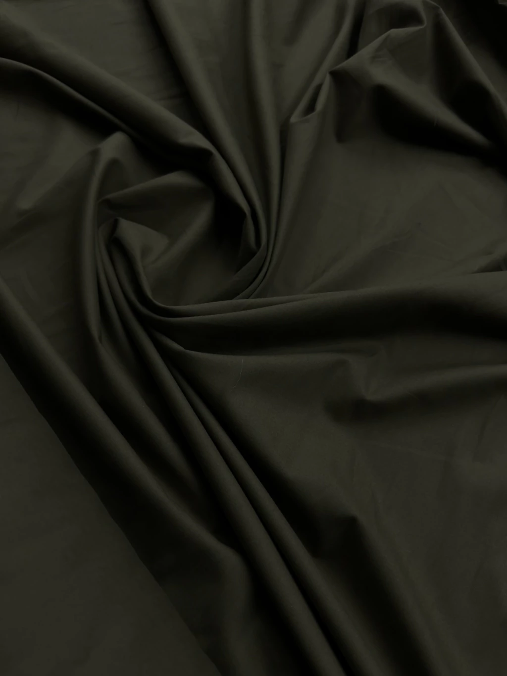 Tecido plano de algodão, tipo tricoline, macia e leve, bom caimento e baixa transparência considerando o tipo de tecido. Pode ser usado para roupas no geral e artigos de decoração. Ton parecido com verde musgo, basicamente um verde escuro.
