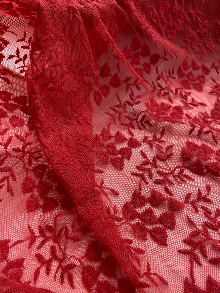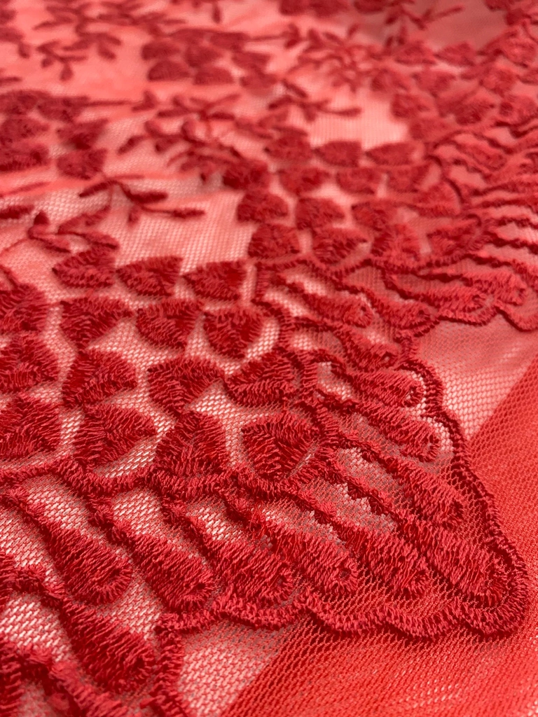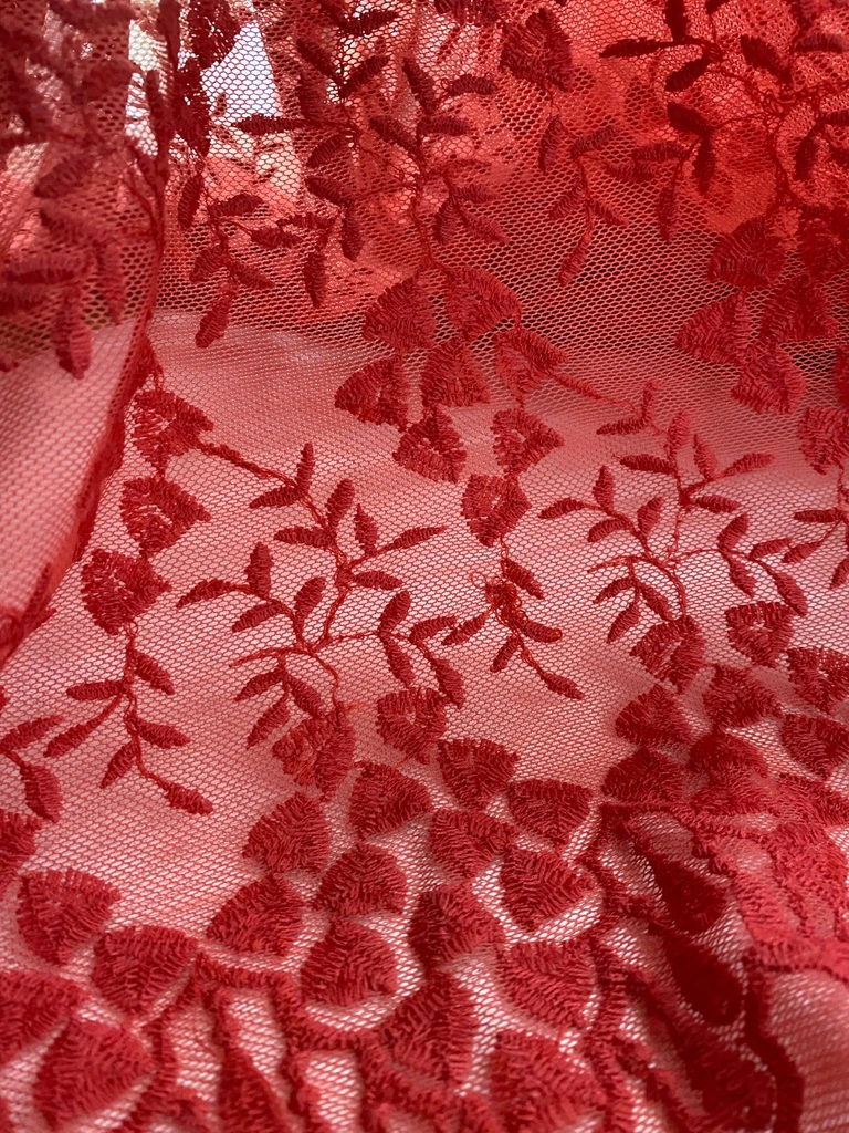 Tecido tule de malha bordada, ton puxado para um vermelho mais claro, mais discreto, macio e leve, com bom caimento e média transparência considerando o tipo de tecido. Pode ser usado para roupas no geral e até artigos de decoração.