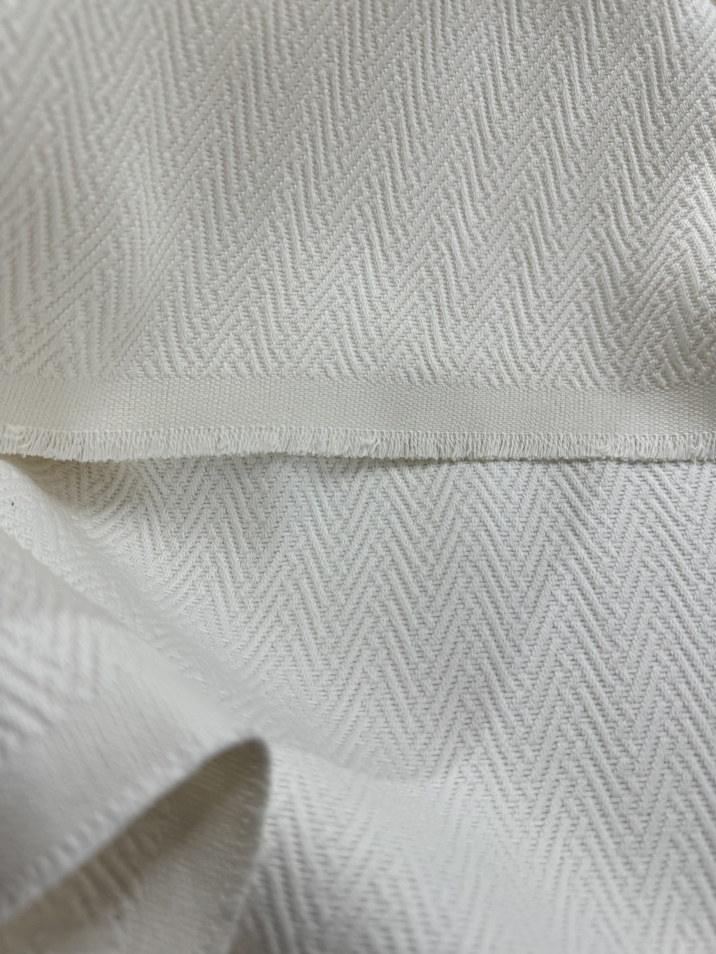 Tecido tweed pesado off, trama em chevron, pode ser usado tanto na confecção de roupas quanto decoração.